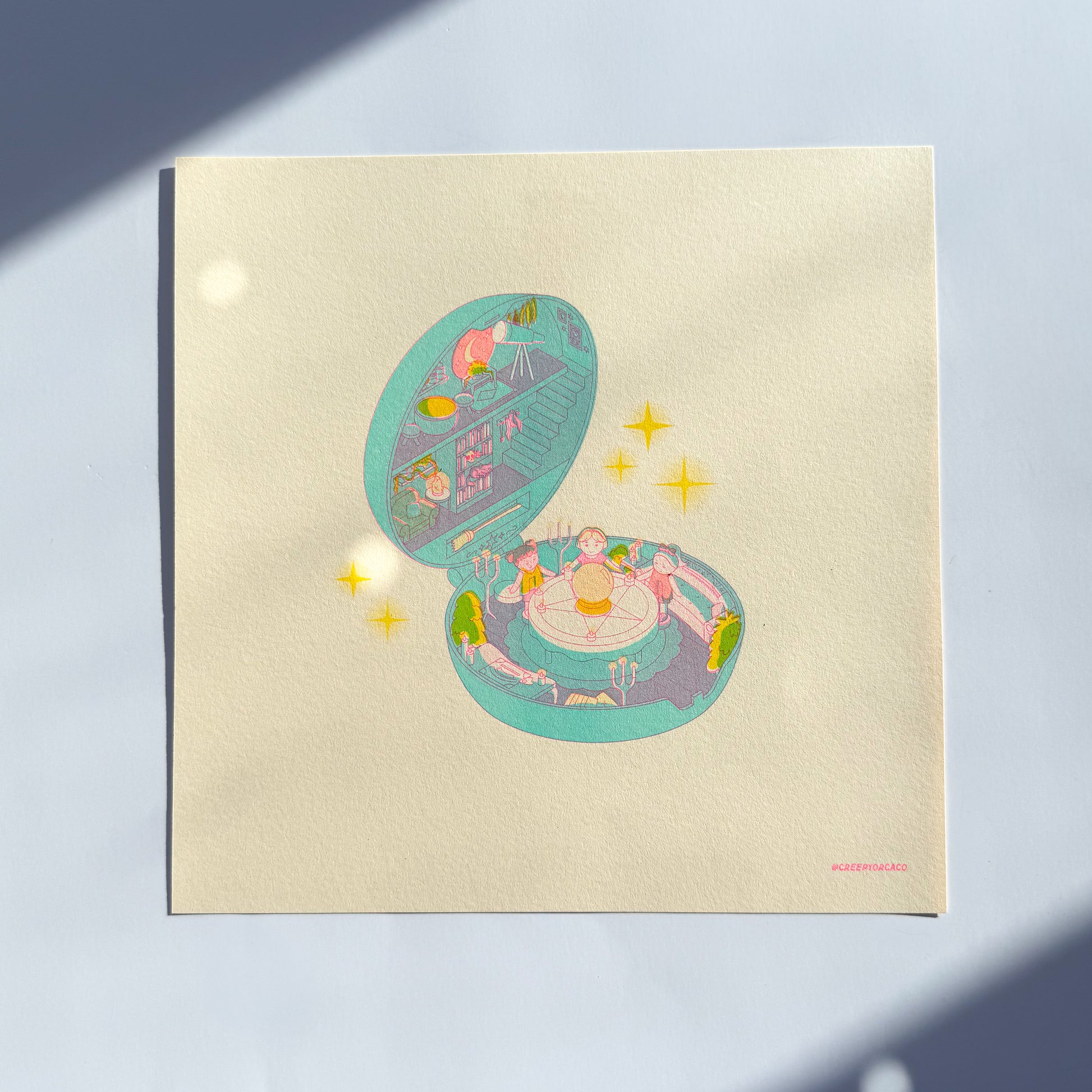 Relive the magic of your favorite 90s compact, but with a supernatural twist. Our Polly Poltergeist print features a charmingly creepy haunted house with three tiny witches gathered around a crystal ball.