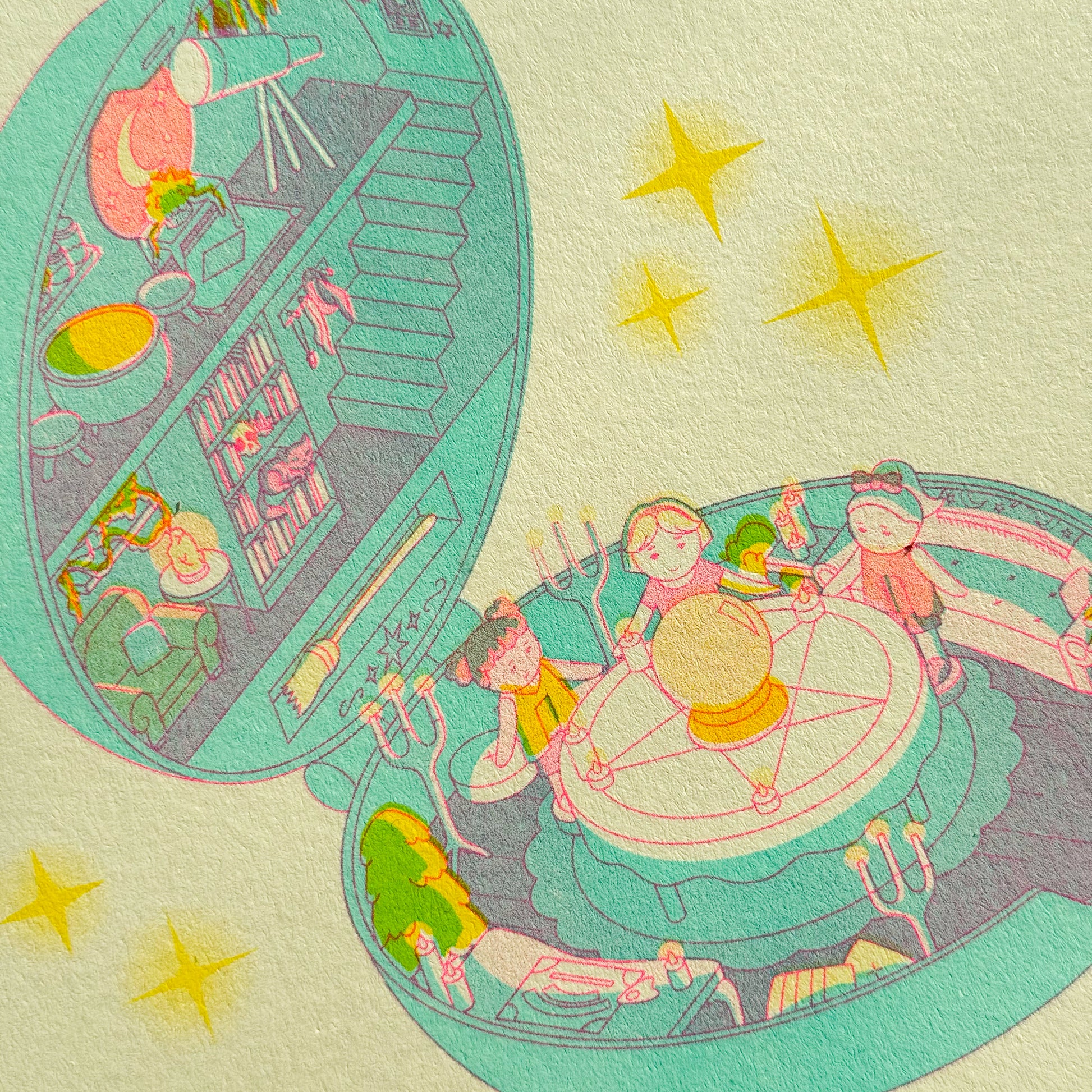 This artwork is brought to life via Risograph printing - a process famous for its vibrant colors and grainy texture. Because of the mechanical nature of the Riso, every print is uniquely "imperfect." Expect slight misalignments and ink variations that make your specific piece a one-of-a-kind artifact.